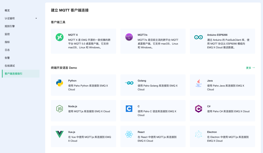 我们优化和更新了主流编程语言的 SDK 连接到 MQTT 服务的代码示例以及讲解,其中包括 Java、Python、Go、C、C#、JS(Node.js)这些常用的开发语言,并且包含 React、Vue、Electron 的示例 Demo 帮助全栈开发者快速使用我们的产品。同时还更新了针对于开发版的 ESP8266 和 ESP32 的教程,让嵌入式开发者更快地连接到 MQTT 服务。您可以根据教程引导(https://docs.emqx.cn/cloud/latest/connect_to_deployments/overview.html),直接复制相关的代码就可以快速实现连接。