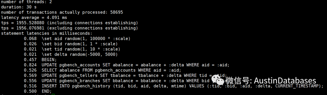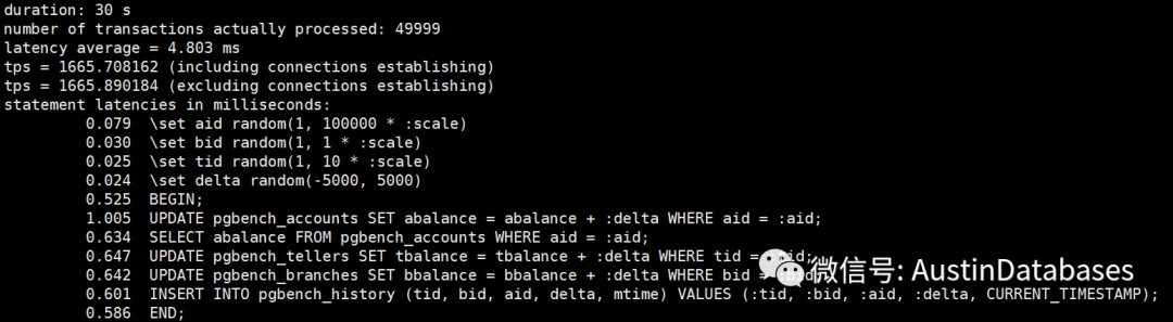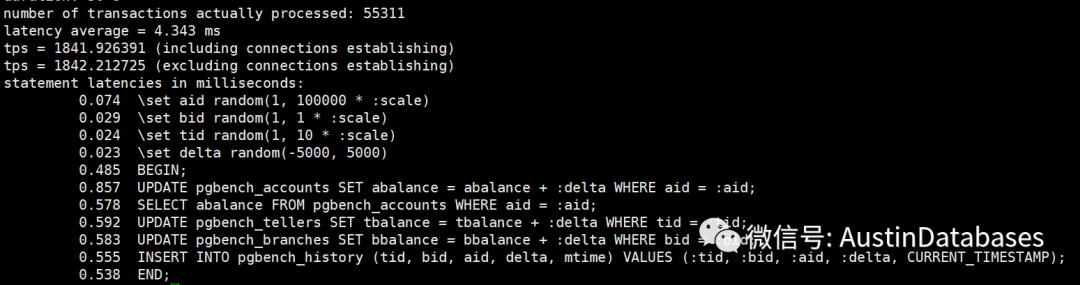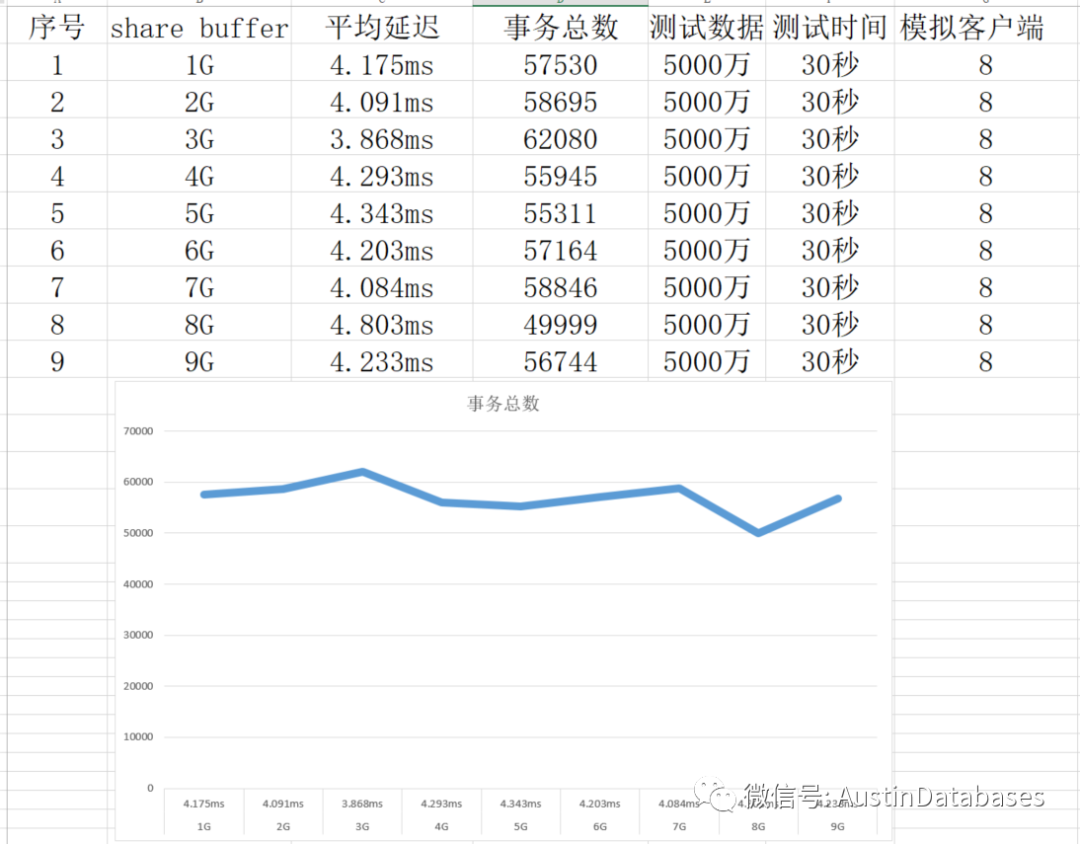 经过一个简单的测试,我们将shared buffer 设置成不同的数值,然后观察每条SQL 的平均延迟,以及30秒内运行的事务总数。当然一下的测试并不严谨,严谨的测试需要在时间,客户端的数量,以及测试数据等等都进行更多的数据测试,并且每个测试至少要测试10次,并取平均数。