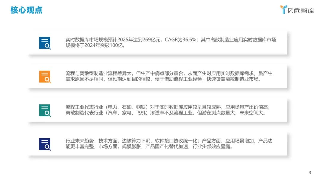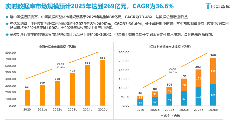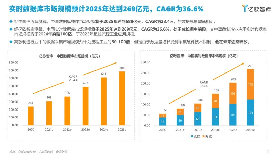 1. 实时数据库市场规模预计2025年达到269亿元,CAGR为36.6%;其中离散制造业应用实时数据库市场规模将于2024年突破100亿。