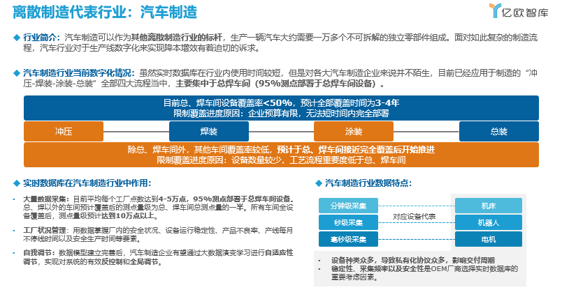 3. 流程工业代表行业(电力、石油、钢铁)对于实时数据库应用较早且较成熟,应用场景产出价值高;离散制造代表行业(汽车、家电、飞机)渗透率不及流程工业,但潜在测点数量大,未来空间大。
