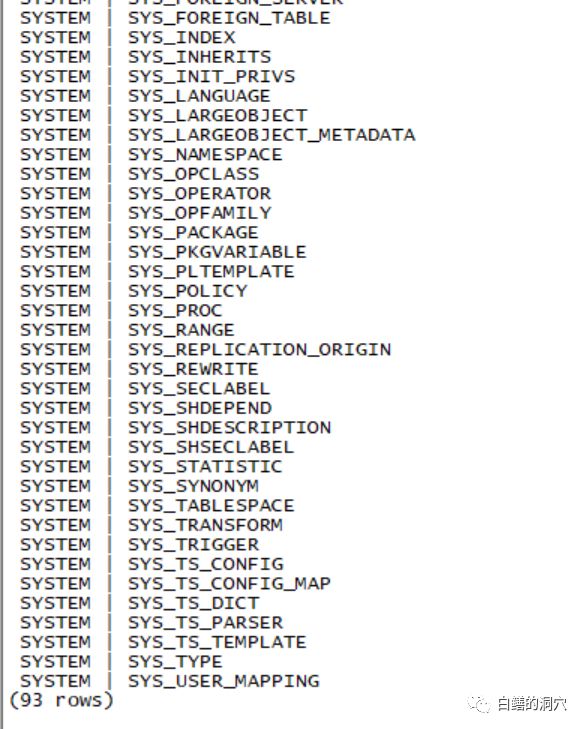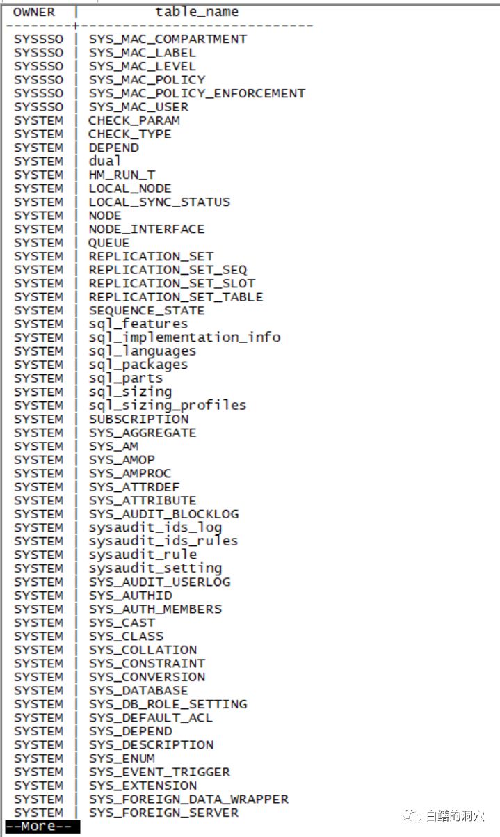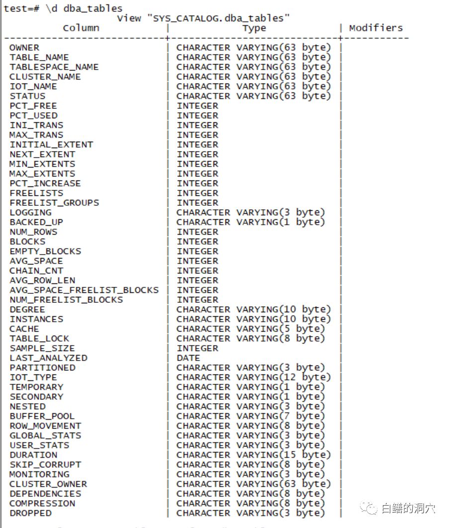 KingbaseES做了不少和Oracle兼容的工作,我们首先来看看dba_tables视图,和Oracle的视图十分类似。我们先看看KingbaseES有哪些表吧: