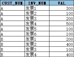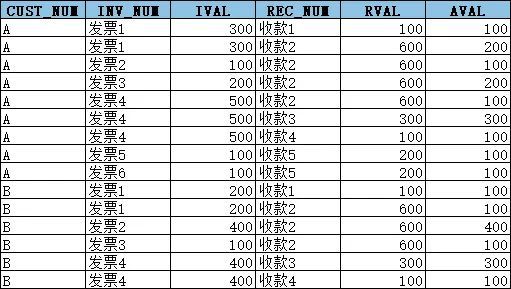 SQL> with invoices as2 (select a.cust_num,3 a.inv_num,4 a.val,5 sum(a.val) over(partition by a.cust_num order by a.inv_num) tval,6 row_number() over(partition by a.cust_num order by a.inv_num) rn7 from demo_invoices a),8 receipts as9 (select b.cust_num,10 b.rec_num,11 b.val,12 sum(b.val) over(partition by b.cust_num order by b.rec_num) tval,13 row_number() over(partition by b.cust_num order by b.rec_num) rn14 from demo_receipts b)15 select i.cust_num, i.inv_num, i.val, r.rec_num, r.val16 from invoices i, receipts r17 where i.cust_num = r.cust_num18 start with i.rn = 119 and r.rn = 120 connect by i.cust_num = prior i.cust_num21 and (prior i.tval > prior r.tval and i.rn = prior i.rn and22 r.rn = prior r.rn + 1 or23 prior i.tval < prior r.tval and i.rn = prior i.rn + 1 and24 r.rn = prior r.rn or25 prior i.tval = prior r.tval and i.rn = prior i.rn + 1 and26 r.rn = prior r.rn + 1);CUST_NUM INV_NUM VAL REC_NUM VAL-------- ------- ---------- ---------- ----------A 发票1 300 收款1 100A 发票1 300 收款2 600A 发票2 100 收款2 600A 发票3 200 收款2 600A 发票4 500 收款2 600A 发票4 500 收款3 300A 发票4 500 收款4 100A 发票5 100 收款5 200A 发票6 100 收款5 200B 发票1 200 收款1 100B 发票1 200 收款2 600B 发票2 400 收款2 600B 发票3 100 收款2 600B 发票4 400 收款3 300B 发票4 400 收款4 100