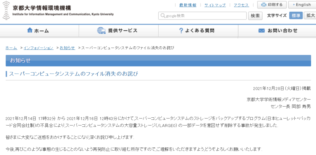 日本京都大学发布公报称,2021 年 12 月 14 日 17 时 32 分至 2021 年 12 月 16 日 12 时 43 分,由于备份超级计算机系统(日本惠普公司制造)的程序存在缺陷,超级计算机系统出现了意外,其中存储(/ LARGE0)中的某些数据被误删除。