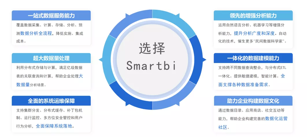 Smartbi一站式大数据分析平台,经过多年的持续发展,凝聚了多年的商业智能最佳实践经验,整合了各行业的数据分析和决策支持的功能需求。满足最终用户在企业级报表、数据可视化分析、自助探索分析、数据挖掘建模、AI 智能分析等大数据分析需求。大数据分析平台,从报表开发的数据准备、样式设计、数据计算、数据可视化、互动逻辑、共享发布六大步骤上都有特色的功能,颠覆了企业软件必须登陆WEB浏览器的传统习惯,允许用户在Excel插件的帮助下,即可完成数据分析应用的设计,并发布到WEB应用中。充分利用了Excel的现有能力,堪称企业报表平台的解决方案专家。尤其在集成了Excel和ECharts后,具备更加丰富的展现力、强大的互动性、超级灵活的布局能力,而且这些都可以在Excel界面上全部完成。