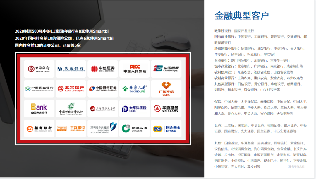 目前,思迈特软件在线开放提供的文档服务日均访问量超过万次:在线开放提供的技术交流社群日均在线超过千人。立足于BI产品的核心能力,思迈特软件的客户群体已成功覆盖金融、政府、制造、能源、零售、教育、地产等行业,拥有华为、国家电网、交通银行、万达集团等3000余家头部客户,几乎在每个行业都能找到标杆客户。客户行业侧重银行等金融领域,从产品早期一直扎根银行,经过多年历练,功能实力雄厚,在金融行业,全球财富500强的10家国内银行中,有8家选用了Smartbi;国内12家股份制银行,已覆盖8家;国内六大银行,已签约4家。全球财富500强的8家国内保险公司已覆盖4家,国内前10的证券公司已覆盖7家。