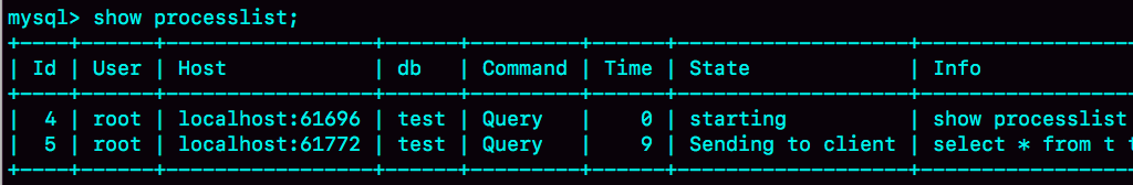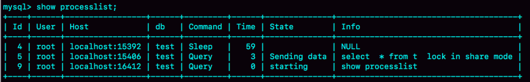 可见session2是在等锁,状态显示为Sending data。