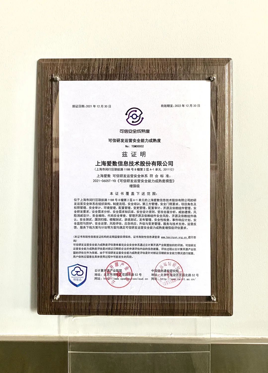 本次爱数研发运营安全能力成熟度通过中国信通院首批测评,充分体现了爱数自身研发运营安全体系的高可靠性,也是行业权威对爱数长期深耕大数据领域获得的实践成果的高度认可。