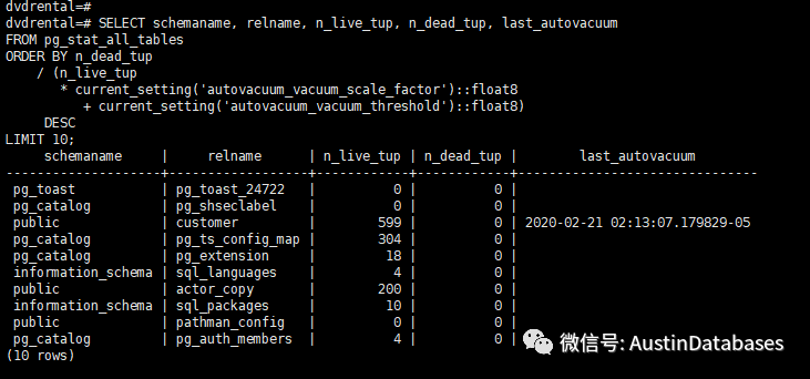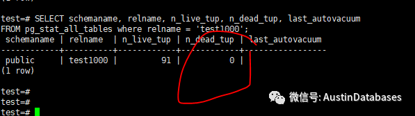 一般的情况下,我们通过上面的语句可以检测我们的autovacuum到底有没有执行,并且当前各个表的n_dead_tupd的情况如何。以及最近一次的 autovaccum 的情况。