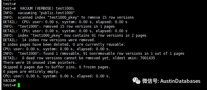 真空的主要工作是回收被标记为dead 的元组占用的存储空间。回收的存储空间不会返回给操作系统,而是在同一个页面中进行整理,因此将来在同一个表中插入数据时可以重用它们。当对特定表执行真空操作时,可以同时对同一表执行其他读/写操作,因为对特定表不执行独占锁。如果没有指定表名,将对数据库的所有表执行VACUUM。