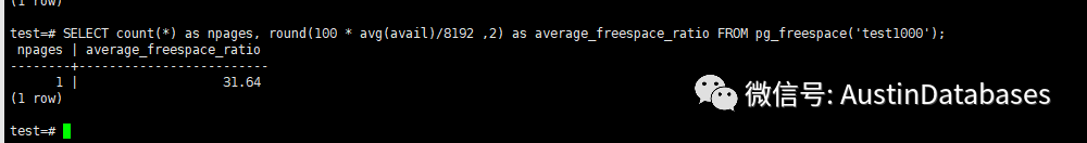 SELECT count(*) as npages, round(100 * avg(avail)/8192 ,2) as average_freespace_ratio FROM pg_freespace('test1000');