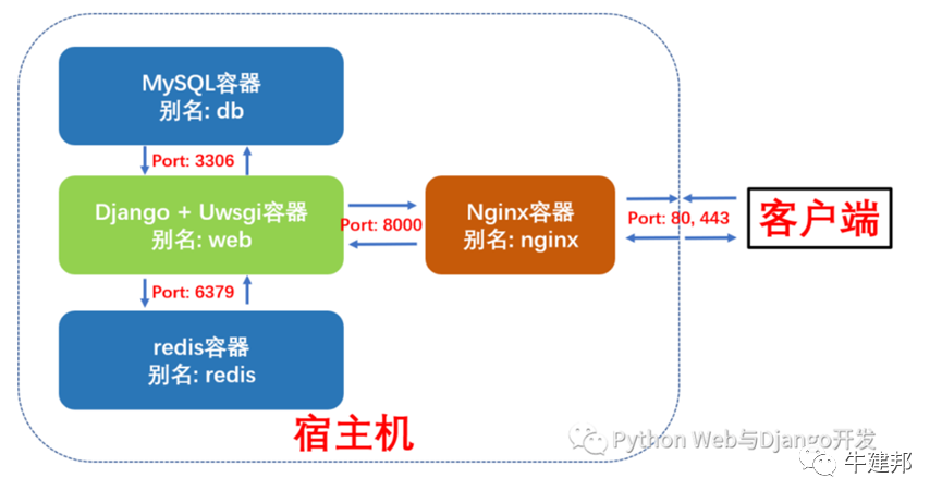 这四个容器的依赖关系是:Django+Uwsgi 容器依赖Redis 容器和 MySQL 容器,Nginx 容器依赖Django+Uwsgi容器。为了方便容器间的相互访问和通信,我们使用docker-compose时可以给每个容器取个别名,这样访问容器时就可以直接使用别名访问,而不使用Docker临时给容器分配的IP了。
