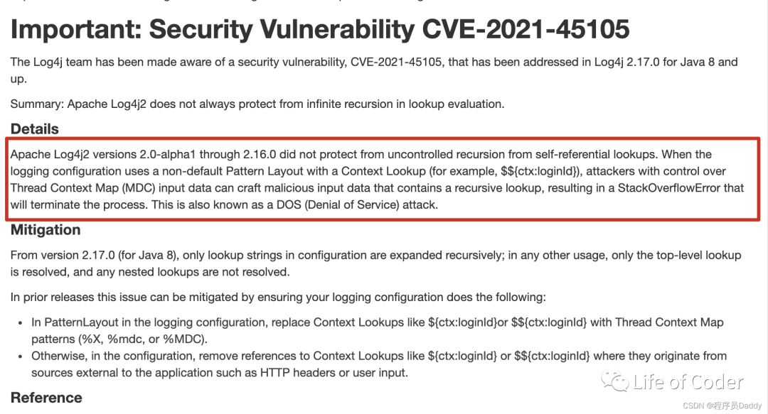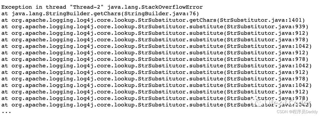 参考:Zero Day Initiative — CVE-2021-45105: Denial of Service via Uncontrolled Recursion in Log4j StrSubstitutor