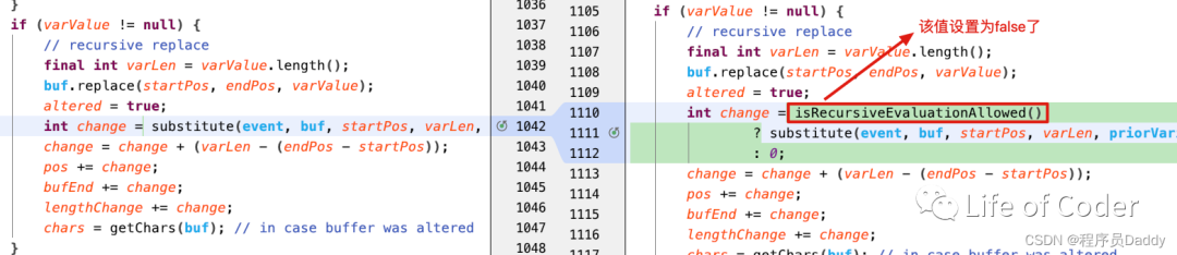 通过原理我们已经知道该漏洞存在的的原因是出现了递归解析。于是在2.17.0版本中的修复手段则比较简单:直接不允许执行递归解析即可。