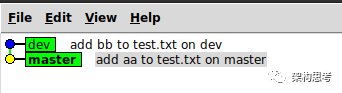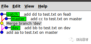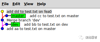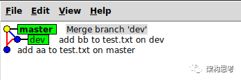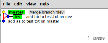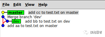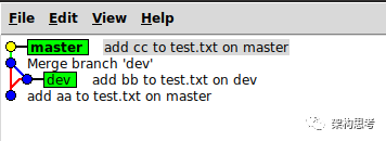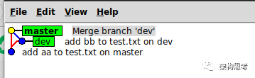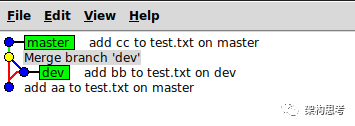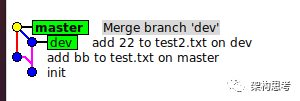 当master和dev分叉后,再merge,会产生如下图所示的分支图: