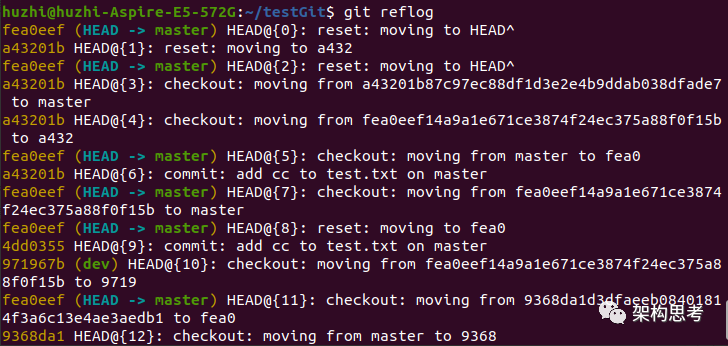 如果回滚完之后又想回到最新的版本,则可以先执行git reflog,查看操作日志: