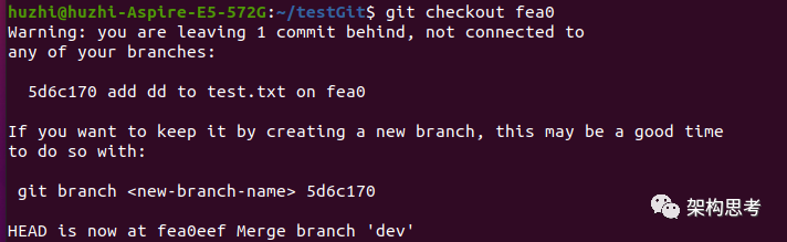 此时,如果执行git checkout fea0,则HEAD会指向fea0,且git会提示: