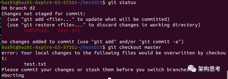 然后切换到d2分支上,在工作区中修改文件,且还未add到暂存区。此时如果git checkout master,会报错: