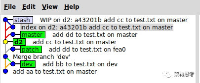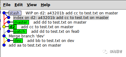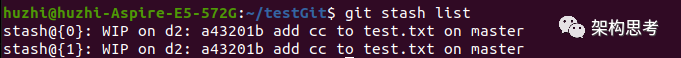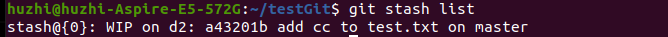 如果再在d2分支上修改test.txt,并git stash,则状态如下图:
