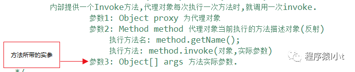 看到第三个参数h,这个参数代表处理类,是个接口,而且它需要采用匿名内部类的方式(没有类名),那么其底层有一个我们必须实现的方法叫invoke方法.如图