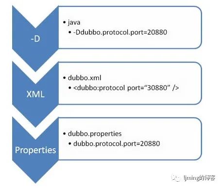 jvm -D 参数: 当启动时,可以轻易地重写配置,比如,改变了dubbo协议的端口。