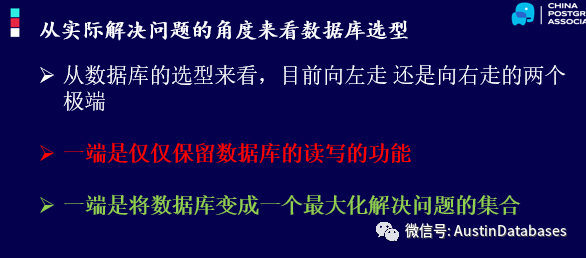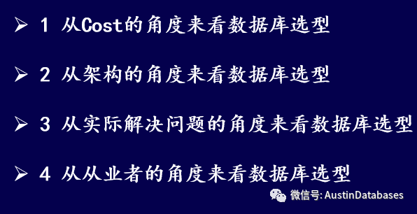 这里主要从四个角度来分析和探讨,我想此时已经有同学就产生一个疑问,为什么不从技术的角度来聊,怎么选数据库,尤其相互比较更好。我想解释一下,为什么不用技术来开始比较,因为技术本身是有其适用的场景的,脱离了场景来讨论一个技术问题本身就是伪命题。没有一个技术是千金方,所以如果一上来就比较的话,就会产生一个问题,我说A,大家不熟悉A场景,所以大家从B场景来理解,那我说的大概率都是不对的。举一个最简单的例子,MYSQL好还是PostgreSQL好,其实这个问题本身没有太大的意义,因为各有各的好。