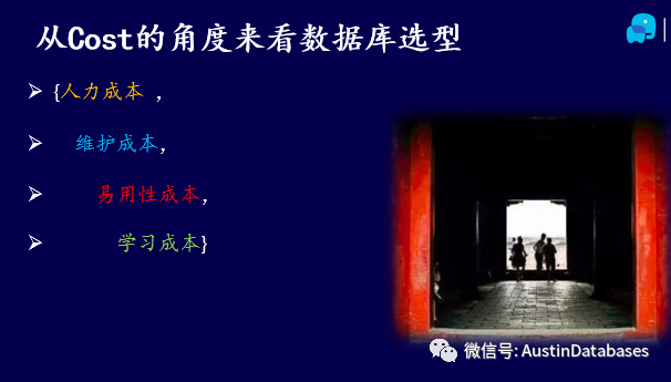 从cost的角度来看得话,其实我们需要考虑以下成本,人力成本,这非常重要,举例使用PostgreSQL 数据库作为我们目前的某个项目的数据库,但需要我们找到熟练通过JAVA 来操作PG,或有这方面经验的开发人员,目前需要培养,很难找到现成的人员,并且项目的时间短,PG的DBA 也比较难找,此时大概率我们就不会选择PG作为此次项目的主要数据库选择。