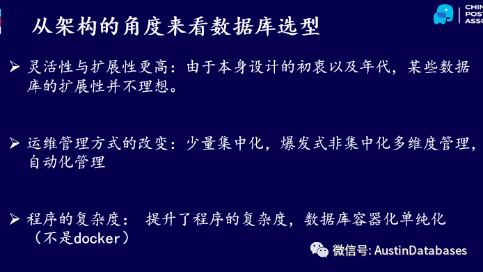 程序的复杂度,程序的复杂度与业务,和底层的架构都有关,实际上选择了不同的数据库后,数据库的使用的方式就有所改变,例如某些开源的数据库,造成数据库本身功能的弱化,程序承担原有数据库方面的可以做的工作,导致数据库承载能力的简单化和容器化。