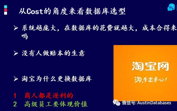淘宝曾经有全亚洲最大的ORACLE数据库集群,再有钱的公司也要核算成本,商人算计的都是利益,那作为高级打工仔要体现价值,并不是收费的数据库不好,是因为免费的已经达到了我们要的功能需求,降低成本,体现价值,何乐不为,如果还能顺便来将这项技术作为一种架构推广,并赚取利益不是更好。