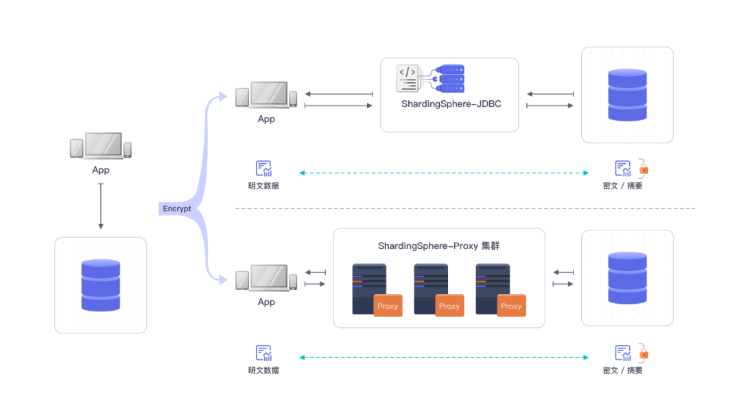 因此最好的解决方案是将数据加解密过程压缩到中间层来实现,其中 ShardingSphere-Proxy 能够直接和数据库进行绑定,通过在应用和底层数据库的中间层做映射,利用兼容不同数据库的协议来将自身『伪装』为一款数据库,从而决定这条 SQL 查询能够落到哪个节点,让上层的应用面向 ShardingSphere 来做编程,同时屏蔽底层数据库所带来的影响。在业务发送请求时数据是明文状态,在经过 Proxy 后自动实现数据的加密并能够在取用数据时进行反向解密。