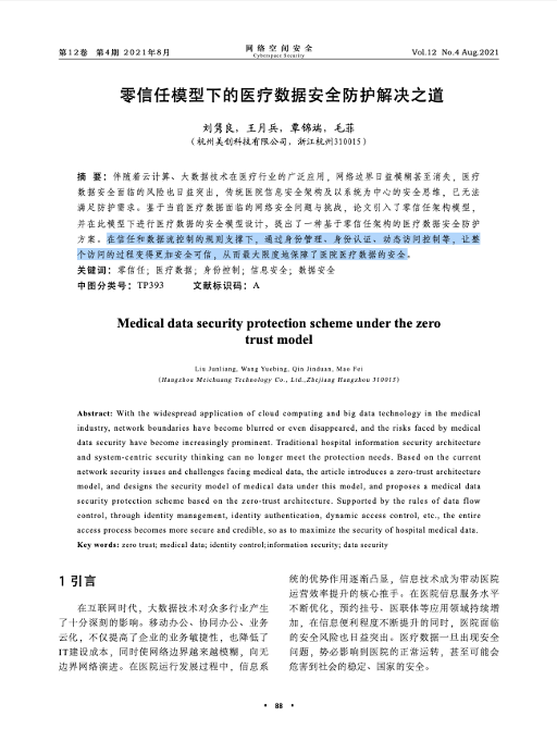近期,美创科技59号安全实验室论文《零信任模型下的医疗数据安全防护解决之道》在《网络空间安全》期刊发表。