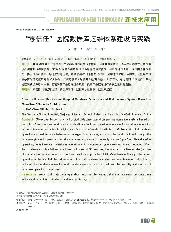 深耕医疗行业多年,美创科技也一直与医疗信息化发展保持同频共振,积极探索与医疗行业场景相适应的数据安全防护方案。今年,美创科技与浙江大学医学院第二附属医院共研共创,联合发表论文《“零信任”医院数据库运维体系建设与实践》于《中国卫生信息管理》杂志刊登。