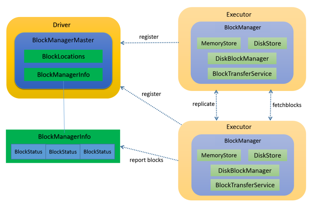 BlockManager提供了一套数据块管理的外部接口,负责本地数据的存取以及与远端BlockManager之间的数据传输。在每个BlockManager对象的初始化过程中会向BlockManagerMaster进行注册,并且各BlockManager会定期、或当数据发生变化时向BlockManagerMaster汇报相关数据块的存储状态。