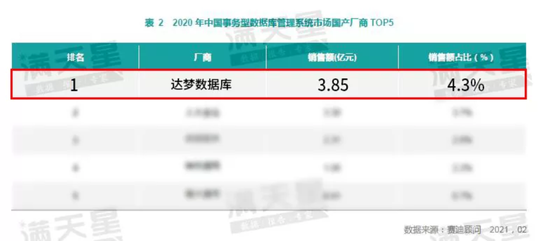 国内权威机构“赛迪顾问”2021发布的行业报告显示:达梦稳居2020年中国数据库管理系统国产数据库市场第一。 达梦已多年蝉联第一。 |