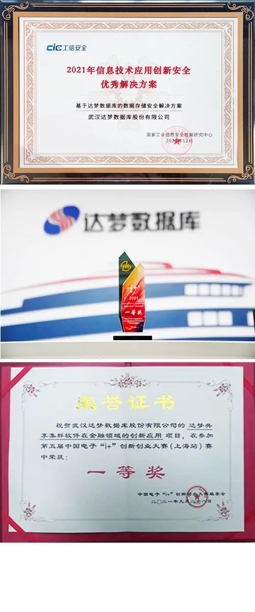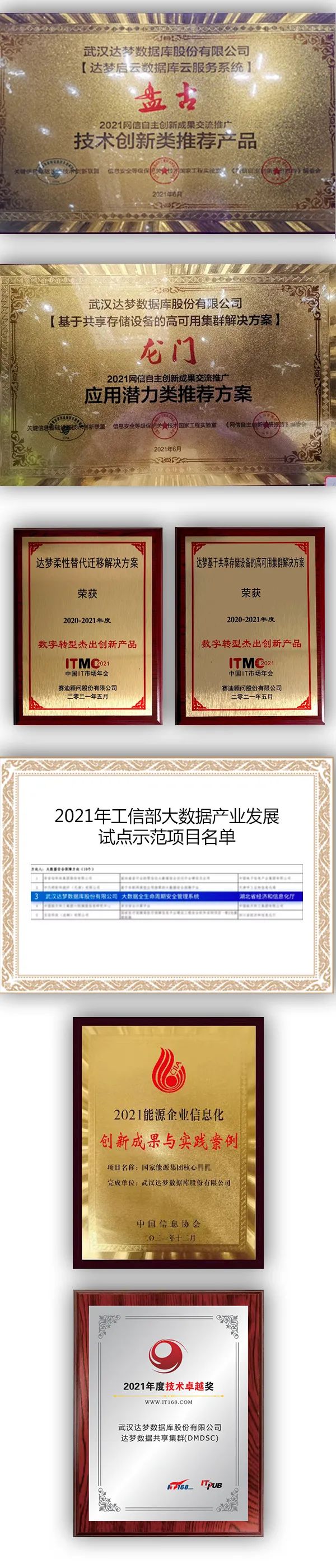 公司“达梦基于共享存储设备的高可用集群解决方案”、“达梦柔性迁移解决方案”荣获“2020-2021年度数字转型杰出创新作品”奖项; “达梦启云数据库云服务系统”荣获“2021网信自主创新成果交流推广技术创新类推荐产品(盘古奖)”; “基于共享存储设备的高可用集群解决方案”荣获“2021网信自主创新成果交流推广应用潜力类推荐方案(龙门奖)”; 达梦“大数据全生命周期安全管理系统”被列入“《2021年工信部大数据产业发展试点示范项目名单》”; 荣获“2021能源企业信息化创新成果与实践案例”大奖; “达梦数据共享集群软件DMDSC”荣获IT168“2021年度技术卓越奖”; ...... |