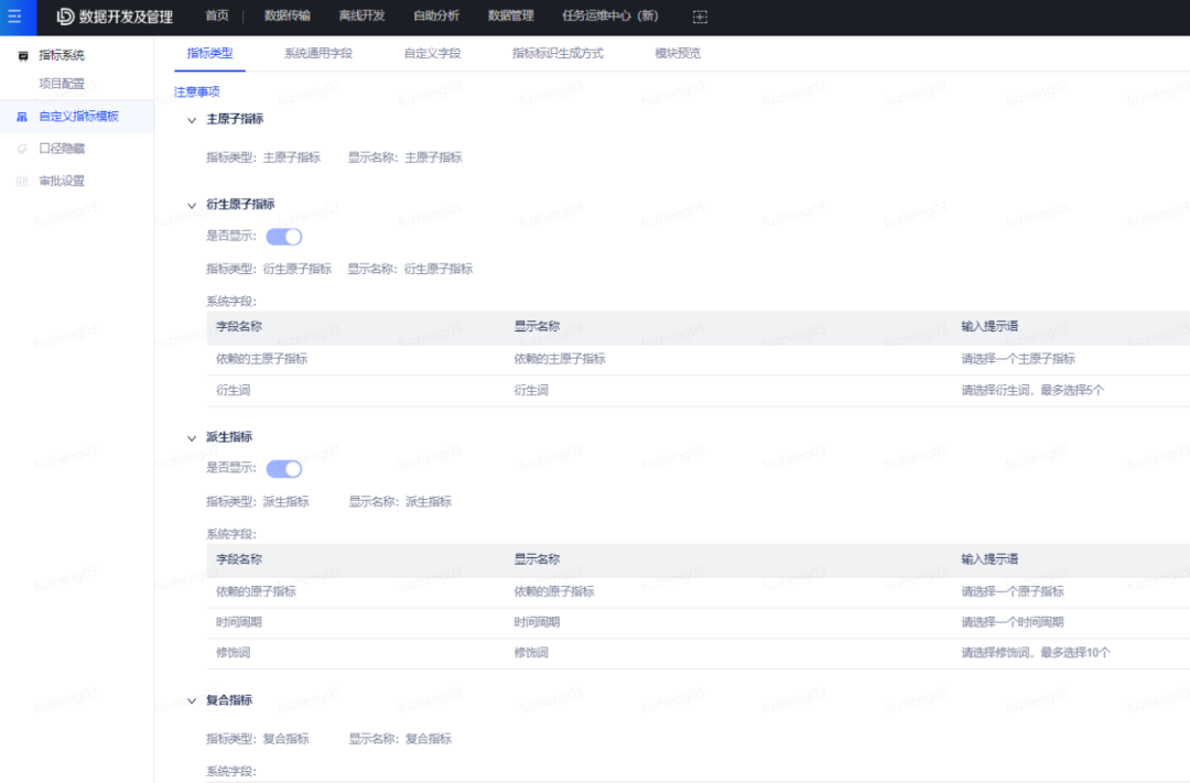 项目配置中心改版,分为自定义指标模板、口径隐藏和审批设置三个功能项。其中,自定义指标模板功能增强,新增指标类型、系统通用字段、自定义字段、指标标识生成方式和模板预览五块内容。用户可根据实际业务需求配置不同的指标模板。