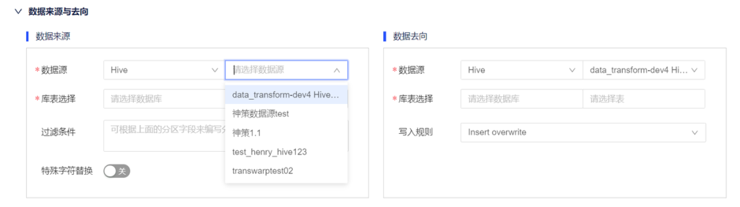 支持读取跨集群Hive数据源,实现Hive2Hive跨集群复制。需要在项目中心(新)中登记跨集群的Hive数据源,目前支持登记的Hive版本为:星环TDH5.2.2、神策Hadoop2.6.0-CDH5.12.1。