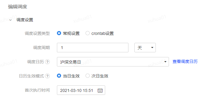 新增调度日历。在离线开发的任务编辑调度时,对于天、小时、分钟调度的任务,可以选择已启用的调度日历。选择调度日历后,可以在日历中设置的“调度日”当日或者次日来执行调度。比如金融券商,常常会有交易日调度的诉求,则可以选用对应的日历。