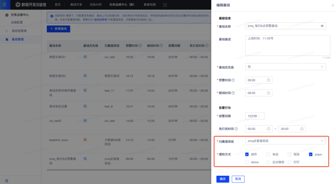 (2)新增基线增加通知方式的设置,去掉值班组通知方式的设置。原来基线告警的通知方式是设置在值班组上的,一个值班组负责多条基线的报警时,所有基线都是用一样的告警模式(例如都是电话,短信),这样就会导致高优基线和低优基线告警方式一样,值班人无法分辨哪些告警是重要的,哪些告警是不重要的。所以需要更改通知方式的设置界面,将通知方式从值班组中设置改为在基线中设置。