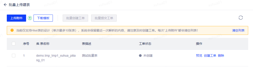 (2)表设计工单管理,新增加“批量上传建表”方式创建表。用户先下载xls模板,并按要求填写模板内容,然后上传附件后,系统会自动解析其中的内容。解析到的每个库表都会生成一条记录。用户可以预览这些记录的详情,系统会自动扫描其相关信息。如果没有异常,用户可以选择提交工单。工单提交后,会和原来的直接创建工单的方式一样,生成一个工单记录。之后,用户可以将任务提交上线,进而开始工单的审批流转。