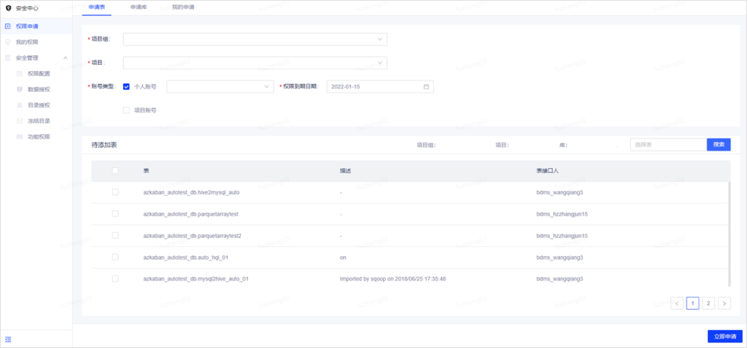 (1)安全中心支持个人、项目账号对已公开库、表的权限申请。