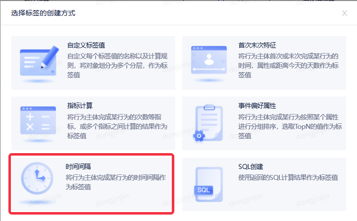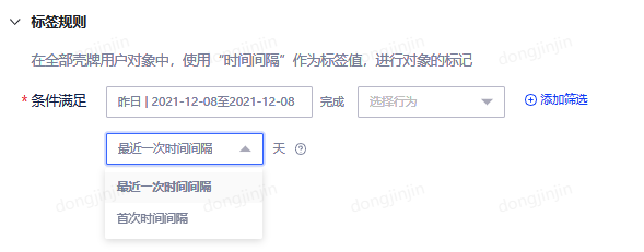新增通过“时间间隔”创建复合标签。当数据模型类型为行为模型时,标签市场创建复合标签的入口新增“时间间隔”这种方式。