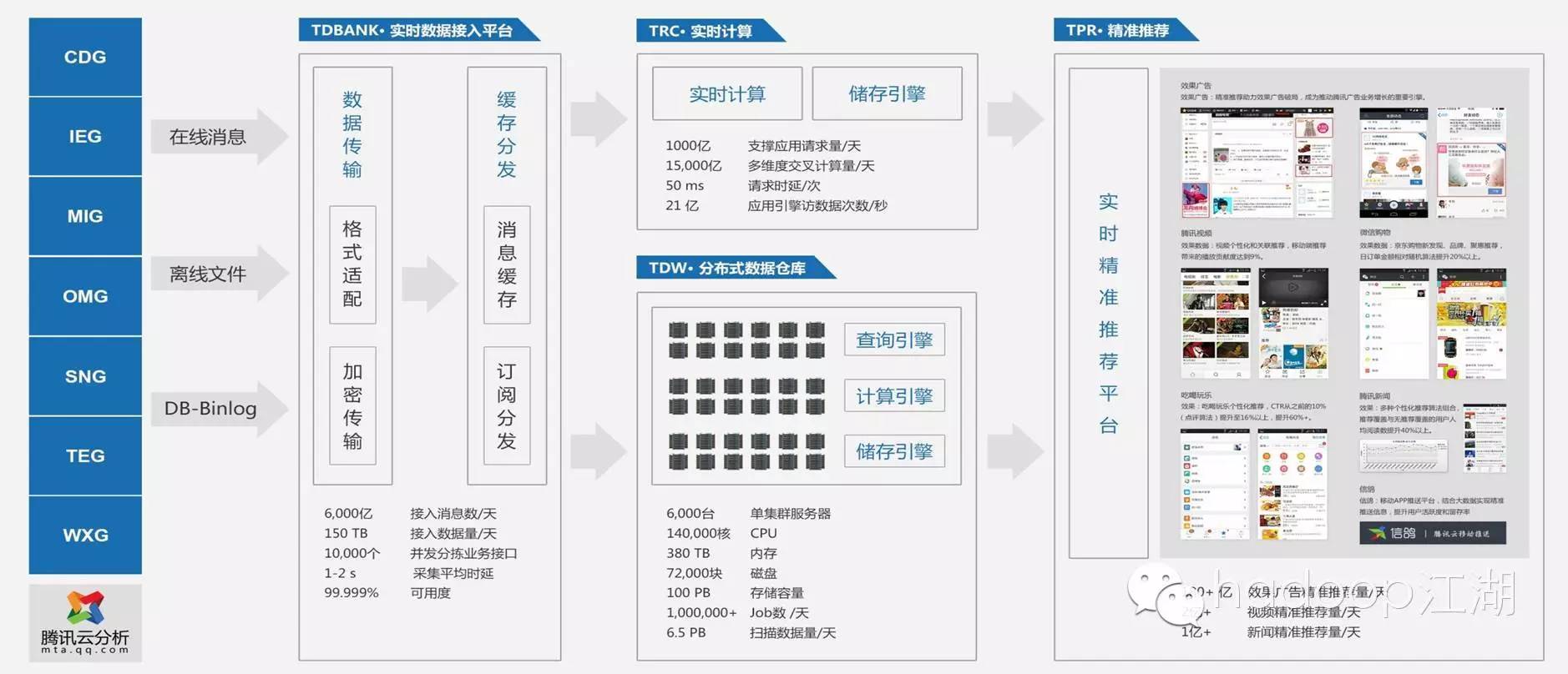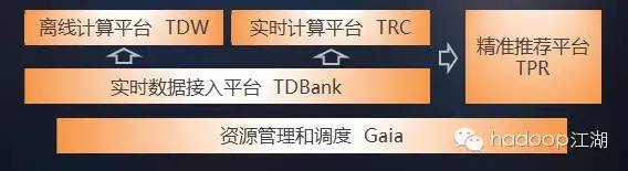 简单来说,TDW用来做批量的离线计算,TRC负责做流式的实时计算,TPR负责精准推荐,TDBank则作为统一的数据采集入口,而底层的Gaia则负责整个集群的资源调度和管理。