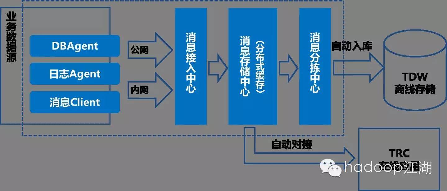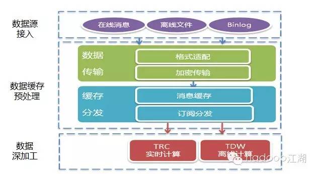TDBank是腾讯在数据接入方面研发的实时数据接入和分发系统,TDBank从业务数据源端实时采集数据,进行预处理和分布式消息缓存后,按照消息订阅的方式,分发给后端的离线和在线处理系统。