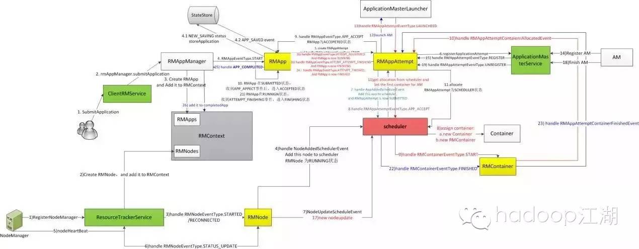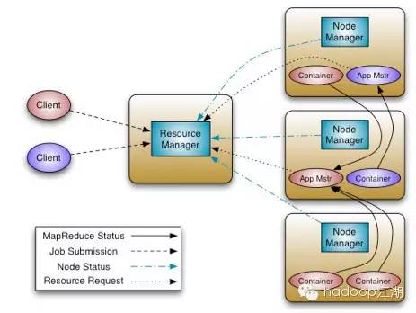 每个 application的ApplicationMaster负责与Scheduler协商合适的container,跟踪application的状态,以及监控它们的进度。从系统的角度讲,ApplicationMaster也是以一个普通container的身份运行。