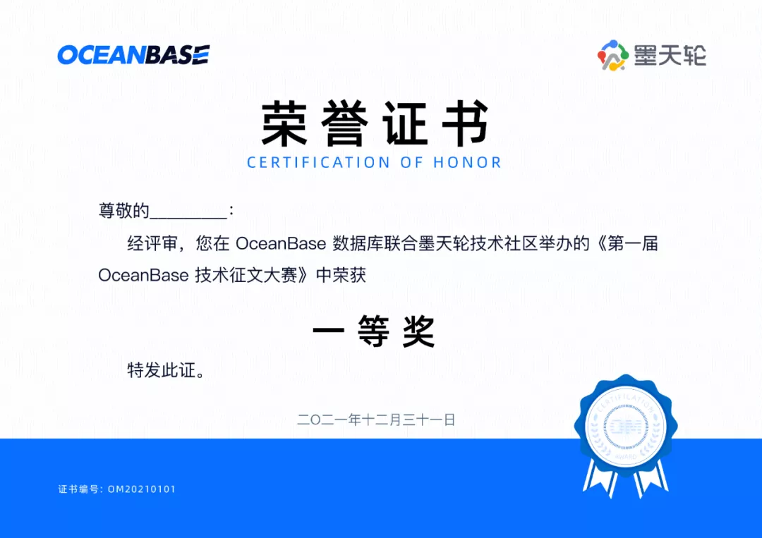 获得一、二、三等奖的9位优秀作者,还将获得 OceanBase 与墨天轮共同颁发的荣誉证书和 OceanBase OBCP认证考试券。