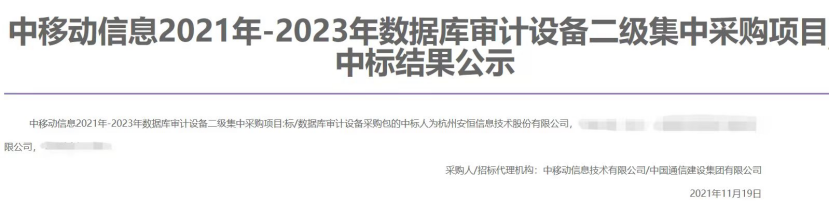 近日,安恒信息以综合排名第一的成绩,从近20家供应商中脱颖而出,第一份额中标中国移动2021-2023年数据库审计设备二级集中采购项目。安恒信息的明御数据库审计与风险控制系统将为中国移动提供数据库审计支持,深入安全数据治理工作,保障数据安全,促进业务稳健良性发展。