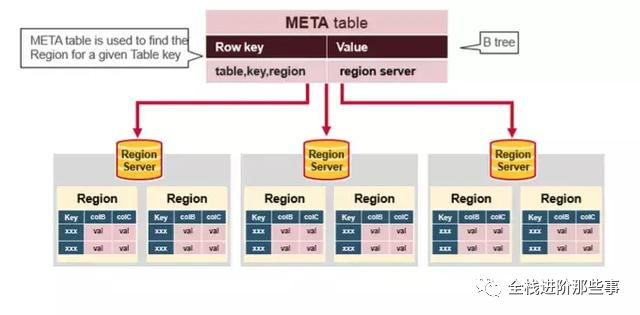 Meta table 是一个特殊的 HBase table,它保存了系统中所有的 region 列表。这张 table 类似一个 b-tree,结构大致如下: