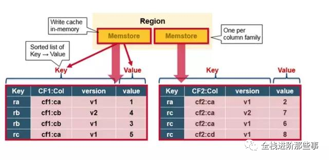 MemStore 在内存中缓存 HBase 的数据更新,以有序 KeyValues 的形式,这和 HFile 中的存储形式一样。每个 Column Family 都有一个 MemStore,所有的更新都以 Column Family 为单位进行排序。