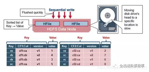 数据存储在 HFile 中,以 Key/Value 形式。当 MemStore 累积了足够多的数据后,整个有序数据集就会被写入一个新的 HFile 文件到 HDFS 上。整个过程是一个顺序写的操作,速度非常快,因为它不需要移动磁盘头。(注意 HDFS 不支持随机修改文件操作,但支持 append 操作。)