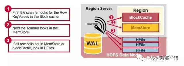 首先 scanner 从 Block Cache 读取 cells。最近读取的 KeyValue 都被缓存在这里,这是 一个 LRU 缓存。
